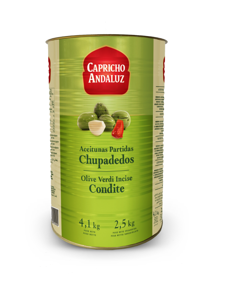 Aceitunas verdes partidas, agua, pimiento rojo, sal, ajos, aceite de oliva, vinagre de alcohol, potenciadores del sabor: glutamato de monosodio y 5'ribonucleótidos de disodio; especias, aromas, acidulante: ácido cítrico; antioxidante: ácido ascórbico; sustancias minerales: cloruro de zinc y sulfato cúprico; conservador: sorbato potásico.