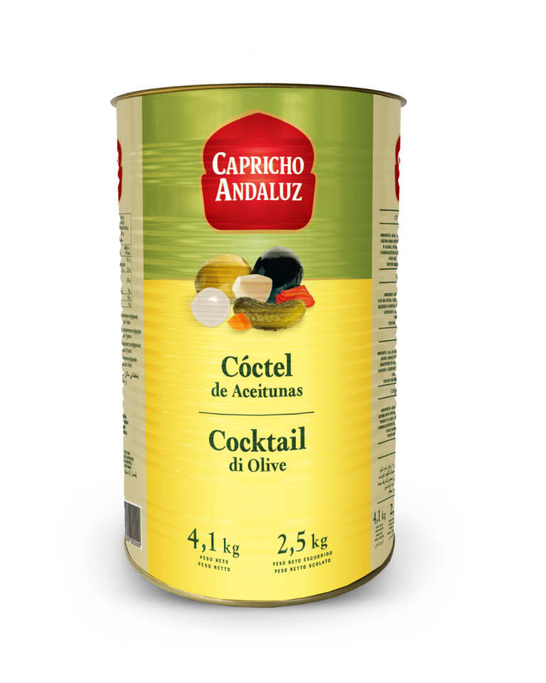Agua, aceitunas verdes enteras, pepinillo, zanahoria, aceituna negra entera, cebollita, sal, pimiento rojo, ajo, vinagre de alcohol, potenciadores del sabor: glutamato de monososdio y 5` ribonucleótios de disodio; acidulante: ácido cítrico; antioxidante: ácido ascórbico; conservador: sorbato potásico.
