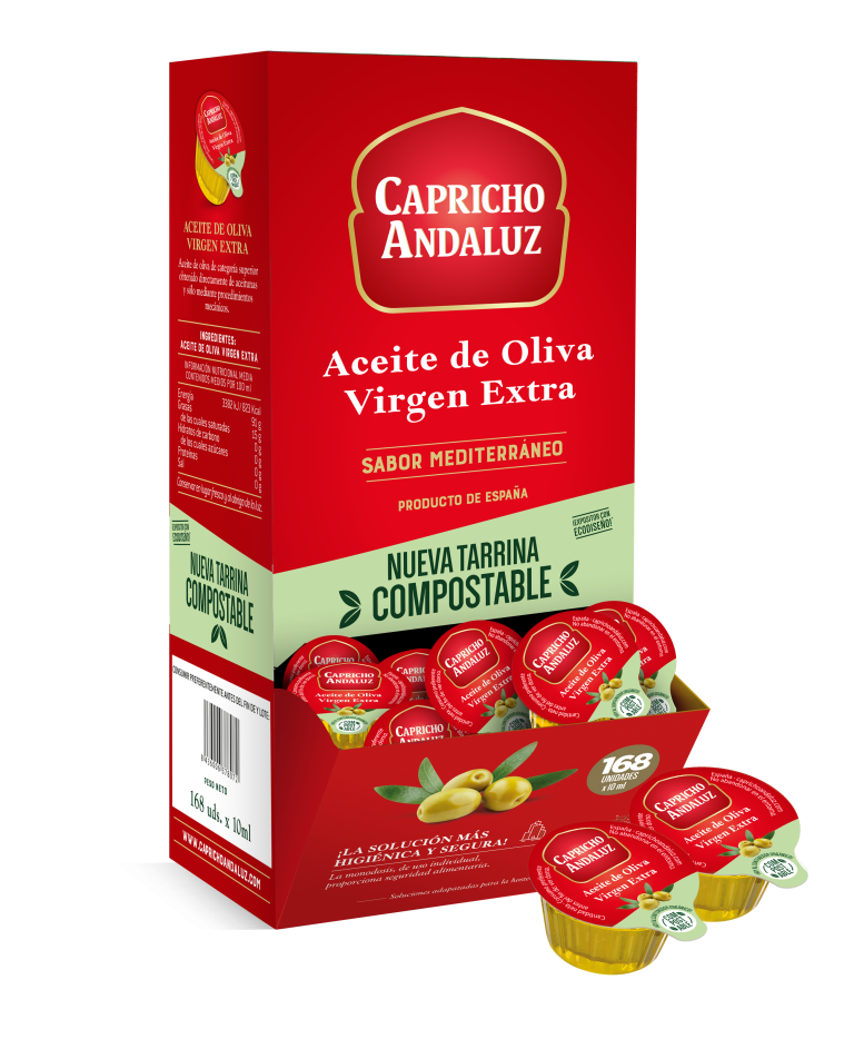 Al elegir este Expositor Aceite Virgen Extra, ofreces 168 tarrinas de 10ml con el auténtico sabor mediterráneo y la máxima calidad virgen extra. Además, sus nuevas monodosis son compostables, demostrando tu compromiso con la sostenibilidad.